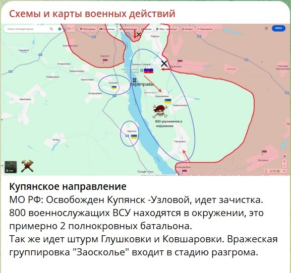 С июня прошлого года мы передали врагу более 12 тысяч трупов. КХ вернула нам тела 265 солдат… По Купянску перед вами карта, нарисованная в подтверждение того, что пгт Купянск-Узловой освобожден, а на восточном берегу Оскола противник окружен. Как это произошло, я по этой карте так и не понял. Могу лишь показать снятое вчера на телефон видео без признаков монтажа и ИИ. ... И опять же видео от врага. Цитата: «Трасса Павлоград-Покровск. Горят 4 авто. 7 км от Павлограда». Причем это типично победобесная погань. Фанатично топящая за Хунту вообще и наркофюрера лично. Ещё цитата: «Молния гонится за нашим тралом и попадает в него. За полсуток эти русские дроны из говна и палок сожгли 6 машин на отрезке трассы Троицкое-Павлоград. Невиданная активность на этом участке». ... И еще одно видео о войне в воздухе тоже от врага. ... По фронту. На Запорожском участке, продвигаясь от Днепра на восток освобождена Новояковлевка. До главной трассы снабжения Ореховского УРа остается менее 10 км. В боях за в
