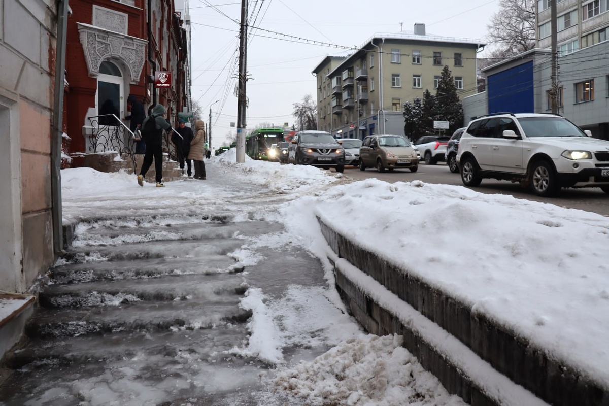 Вчера в городе был снегопад. Ночью ударил мороз, снежная каша замерзла и местами в Курске очень скользко. Как отметили в пресс-службе правительства региона, через несколько часов в регионе снова пойдёт снег, и работы дорожникам и коммунальным службам только прибавится. Водителей попросили быть предельно внимательными за рулём, соблюдать дистанцию и скоростной режим. Фото: Александр Баламутов