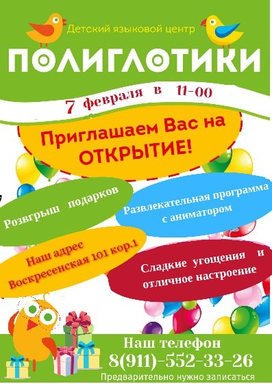 ! 🎉 Совсем скоро в вашем городе откроется детский образовательный центр «Полиглотики»! 🎓 📅 Дата открытия: 7 февраля 2026 года 🕧 Время: 11:00 📍 Адрес: ул. Воскресенская, 101, корп. 1 ❗️ Пишите в телеграм: https://t.me/poliglotiki_arkhangelsk Что ждёт вас на торжественном открытии? ✨ - знакомство с нашим центром и командой педагогов; - весёлый аниматор и развлекательная программа 🦸; - розыгрыш призов для маленьких гостей 🎁; - сладкие угощения 🧇; - море позитива и хорошее настроение! 🩷 ❗️ Важно: посещение мероприятия возможно только по предварительной записи! 📞 Записаться и узнать подробности можно по телефону: 8 (911) 552‑33‑26 Режим работы центра: понедельник–суббота: с 9:00 до 20:00; воскресенье: выходной. Ждём вас и ваших детей на открытии «Полиглотики»! 🥳 #Полиглотики #Архангельск #ОткрытиеЦентра #ДетскийЦентр