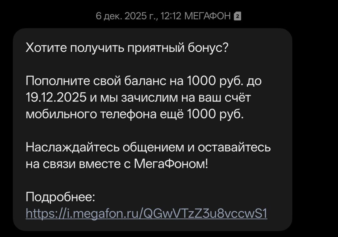 При чём вот в декабре присылали такую же смску, только чуть дороже, и реально 1000₽ добавили на баланс.