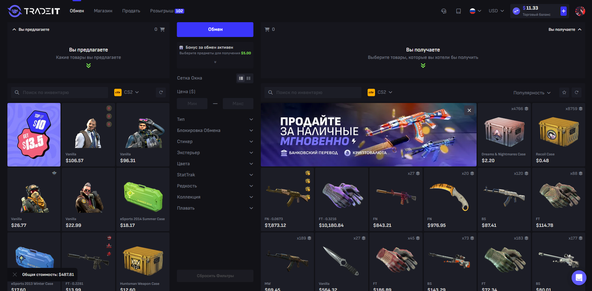 - Мгновенный обмен скинов и быстрый вывод средств на банковские карты, криптовалюты и другие популярные способы оплаты.