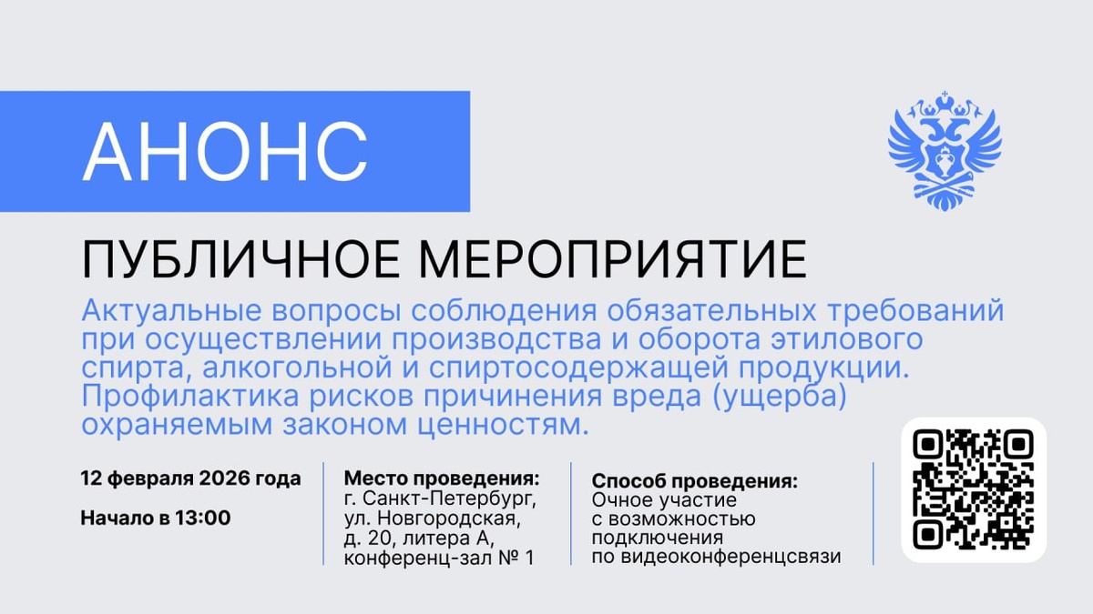 сообщает, что 12 февраля 2026 года в 13:00 для участников алкогольного рынка, осуществляющих деятельность на территории Северо-Западного федерального округа, состоится публичное мероприятие. Тема мероприятия «Актуальные вопросы соблюдения обязательных требований при осуществлении производства и оборота этилового спирта, алкогольной и спиртосодержащей продукции. Профилактика рисков причинения вреда (ущерба) охраняемым законом ценностям». Публичное мероприятие состоится в формате круглого стола с возможностью подключения по видеоконференцсвязи. В ходе мероприятия будут рассмотрены следующие вопросы: ▶️ о ситуации на алкогольном рынке в Северо-Западном федеральном округе ▶️ изменения в законодательстве о государственном регулировании производства и оборота этилового спирта, алкогольной и спиртосодержащей продукции, вступающие в силу с 2026 года ▶️ правоприменительная практика в сфере контроля за оборотом этилового спирта, алкогольной и спиртосодержащей продукции В мероприятии примет у