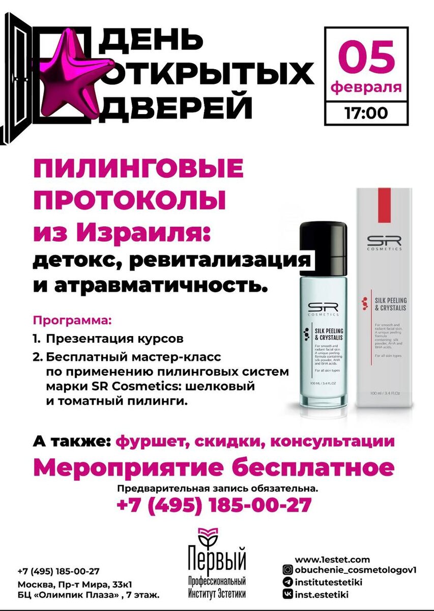 ! ⏰ 5 февраля 17:00 🔥 ПИЛИНГОВЫЕ ПРОТОКОЛЫ из Израиля: детокс, ревитализация и атравматичность 💫 В программе: Презентация программ обучения Бесплатный мастер-класс по применению пилинговых систем марки SR Cosmetics: шелковый и томатный пилинги. 📌Знакомство с преподавателями и учебным центром 📌 Возможность получить ответы на вопросы от ведущих преподавателей в косметологии; 📌Максимально низкая стоимость курсов обучения; 📌Возможность завести новые знакомства и пообщаться с единомышленниками в непринуждённой обстановке за 🥂 👌🏻Запись обязательна! 📍Наш адрес: проспект Мира, 33, корпус 1, 7 этаж 📲Пишите в комментарии и лс