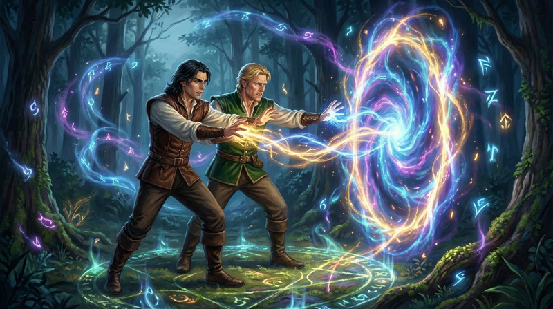 Они встали по обе стороны от древнего дуба, в стволе которого пульсировал маревом зачарованный портал. Элвин начал. Сначала это был едва слышный шепот, слова древнего языка, которые не произносились, а рождались прямо в воздухе. Затем голос окреп, стал тягучим, гипнотическим напевом. Магия пришла не извне, а из самой ткани мироздания. Воздух заколебался, и из пустоты стали проявляться тончайшие нити чистого света и энергии. Они струились, как реки, к воздетым рукам Элвина и Платона-Кайлана. Сила, дикая, первозданная, наполняла их, жгла изнутри. Это было и больно, и блаженно.