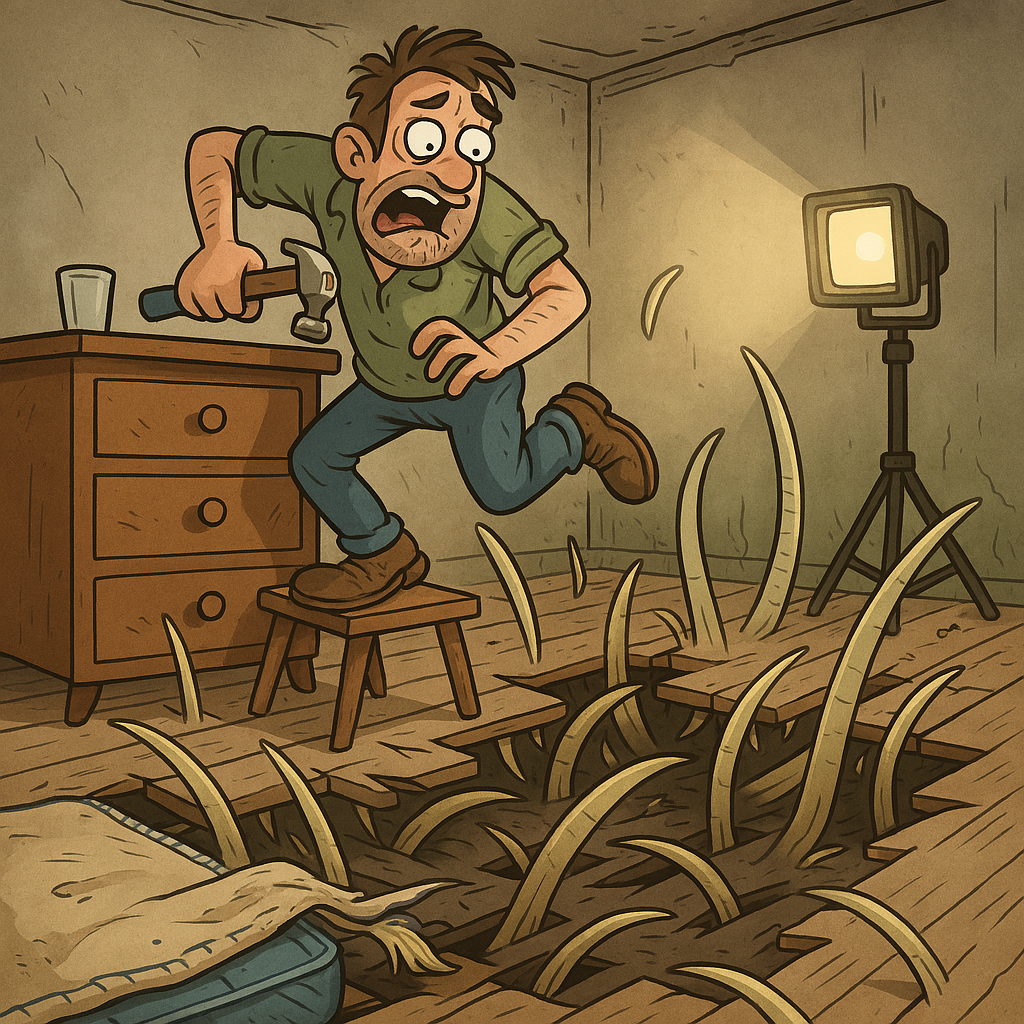 Купил я, значит, саманный дом. Почему? Потому что люблю рисковать, а ещё потому что цена была такая, что даже Авито спросило: «Ты уверен?». Наследники продавали дом так быстро, будто он был заражён налоговой. Я, конечно, сразу понял: подвох в полах. Ну а где же ещё. Захожу внутрь — полы мягкие, как будто дом решил стать батутным центром. Я хожу, а он подо мной бум-бум, как будто приветствует: «Добро пожаловать, дружок, сейчас мы тебя съедим». Я, естественно, делаю вывод: «Ну, стяжка решит». Оптимизм — моё второе имя. Разбираю полы. Под ними не земля, не песок, а какая-то серая труха, пахнущая так, будто муравьи сварили борщ из аккумуляторной кислоты. Я вдохнул — и понял, что лёгкие у меня теперь новые, кислотостойкие. Устал, лёг спать прямо на полу. На матрас, который видел больше историй, чем Википедия. Закрыл дверь, вырубился. И тут — тюк. Тюк. Пол стучит. Я, как воспитанный человек, стучу в ответ: «Тихо там!». Пол обиделся и дал мне в рёбра так, что я подумал: «Ну всё, дом начал ди