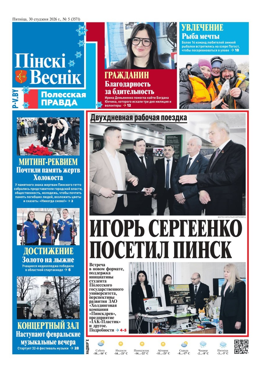 » ☑️От конструкторов до автогигантов: блогеры Пинска увидели, как создаётся промышленная мощь города В городе состоялся уникальный семинар-тур для представителей блогерского сообщества, который лично провела первый заместитель председателя горисполкома Ирина Максимюк. ☑️Золото на лыжне: учащиеся Пинского медколледжа победили в областной спартакиаде! Команда лыжниц Пинского медицинского колледжа завоевала первое место на областных соревнованиях по лыжным гонкам. ☑️Живые цветы – неживым свидетелям: в городе почтили память жертв Холокоста 27 января в Международный день памяти жертв Холокоста на улице Кирова состоялся митинг-реквием. ☑️Игорь Сергеенко: «Определить точки соприкосновения и взаимодействия депутатского корпуса и местной исполнительной власти» ↪️Также в свежем выпуске еженедельника новости спорта, прогноз погоды, гороскоп. Еще больше новостей: p-v.by @Пинский Вестник 📱Ютуб 📱ВК 📱ИНСТАГРАМ 📱ОК 📱ФЕЙСБУК 📱ТИК ТОК Прислать новость