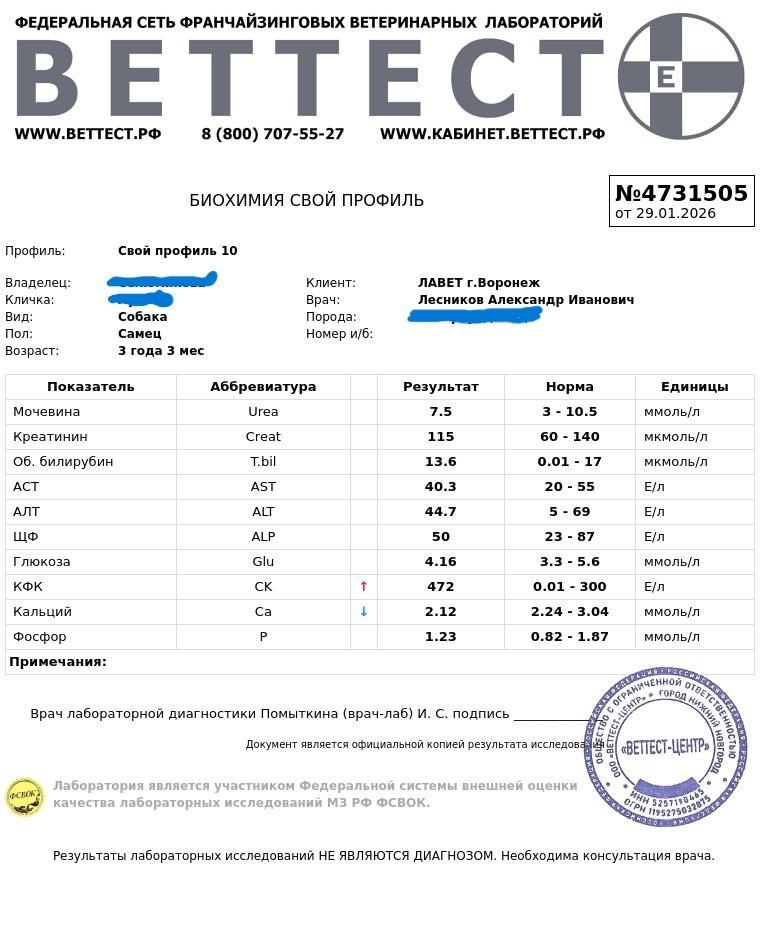 (хотите вместе с нами поразмышляйте). Одна из интереснейших работ - интерпретация показателей в анализах. Кратко (основные отклонения). Гематология (ОАК) - картина слабовыраженного воспалительного процесса. Лейкоциты (WBC): 5.63 (норма 6-17) — легкая лейкопения/нижняя граница нормы. Нейтрофилы (SEGS): 3.04 (норма 3.6-13.09) — легкая нейтропения (снижение). Лимфоциты (LYMP): 33% (норма 12-30) — относительный лимфоцитоз (повышение процента). Моноциты (MONO): 0.17 (норма 0.18-1.7) — легкая монопения (снижение). Комбинация легкой нейтропении с относительным лимфоцитозом часто указывает на вирусную инфекцию, хронический вялотекущий воспалительный процесс или реакцию на стресс. Картина не критическая, но говорит о том, что иммунная система активно работает. Ключевые "находки": Креатинкиназа (КФК): ↑ 472 (норма до 300) — значительное повышение. Это специфичный маркер по