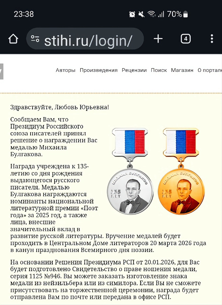 Сегодня я опубликовала пост - первый за целый месяц. Похвасталась своей наградой, медалью Михаила Булгакова.