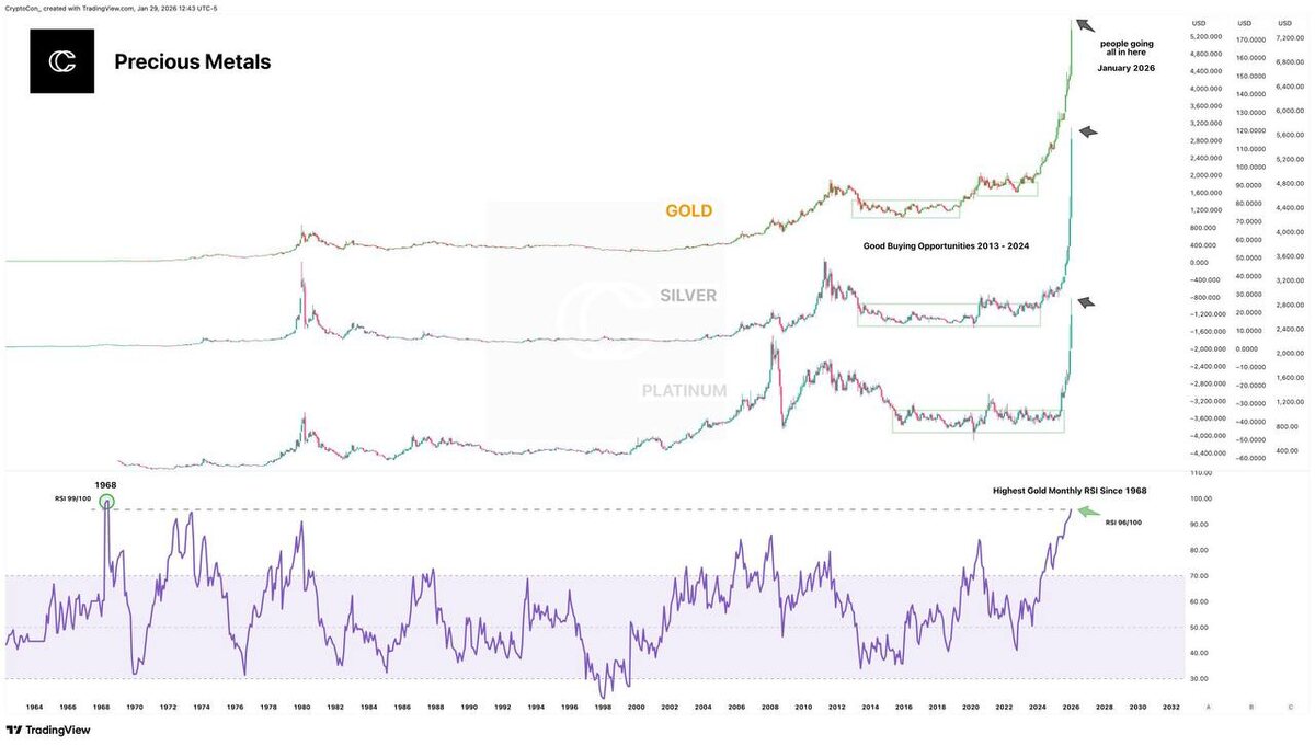 Звучит резко, но происходящее сейчас с золотом и серебром очень напоминает поведение мемкоинов на пике цикла. Все обсуждают. Все уверены, что «на этот раз всё иначе». Инфлюенсеры массово прыгают в тему и призывают полностью переложиться в металлы. Проблема не в золоте и не в серебре как таковых. Проблема — во времени входа. Лучшее время для покупки драгоценных металлов было тогда, когда они были скучными. С 2013 по 2024 год. Десять лет боковика, без хайпа, без интереса, без эмоций. Именно тогда их никто не хотел. Именно тогда и нужно было покупать. Сейчас мы наблюдаем обратное: параболический рост исторические экстремумы по RSI массовый приток розницы нарратив «это единственный безопасный актив» Это не начало цикла. Это его перегрев. Единственное действительно корректное сравнение — 1980 год. Тогда тоже казалось, что золото — вечный ответ на все проблемы системы. И тогда тоже покупали «на всякий случай», «навсегда», «потому что страшно». Чем это закончилось, история уже показал