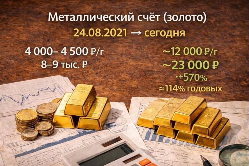 📓 🥇 Золото. 2021 → сегодня В 2021 году я открыл металлический счёт. Без пафоса. Без крупных сумм. Просто начал покупать золото постепенно. 🔸 цена тогда: 4 000–4 500 ₽/г 🔸 объём: 1,9 грамма 🔸 портфель: 8–9 тыс. ₽ Сегодня: 🔸 цена: ~12 000 ₽/г 🔸 портфель: ~23 000 ₽ 🔸 рост: ≈ +570% (≈114% годовых) Это не хайп. Это долгосрок, дисциплина и стратегия. ➡️ В инвестиционном дневнике рассказываю, как работает финансовая система на практике, а не на словах — с цифрами, сроками и выводами. https://t.me/InvestDiary_AKhab