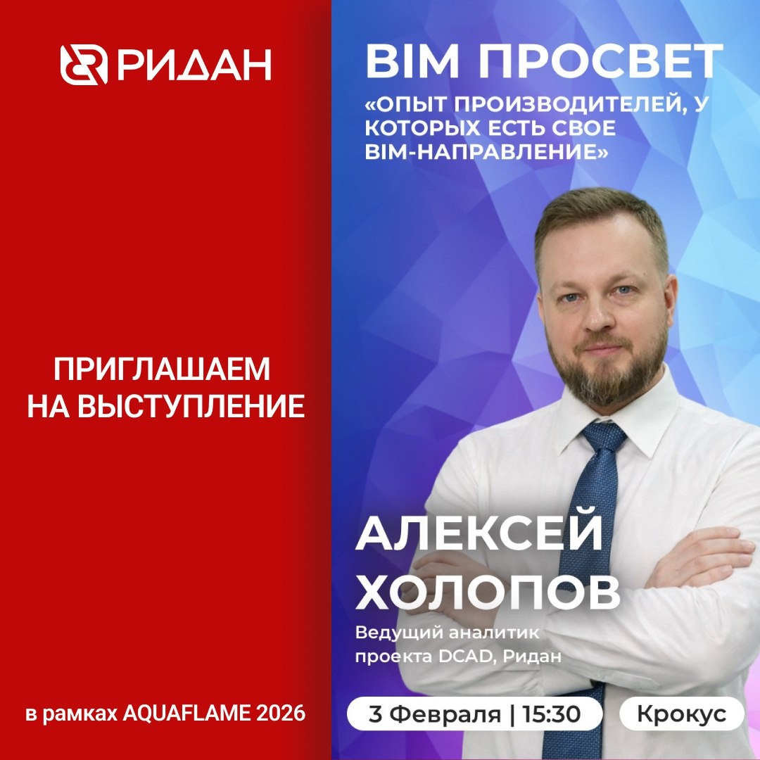 и перехода на безбумажный документооборот. Мы приглашаем вас на отраслевой митап BIM Просвет в рамках выставки AQUAFLAME 2026, где расскажем о собственном опыте создания и систематизации каталога BIM-семейств. Наше выступление будет посвящено практическим решениям, которые повышают эффективность работы. Ждем вас — будет полезно и познавательно. 🔤 Эффективность. Инновации. Развитие #ридан_event