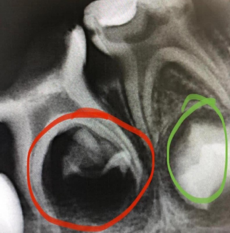 Пример: На снимке два молочных зуба, под которыми находятся зачатки постоянных зубов — зеленый кружочек. То, что отмечено красным — погибший зачаток, инфекция на который попала с молочного зуба. Родители этот зуб решили не лечить, мол, сам выпадет через пару лет - частая ошибка. Итог — у ребенка никогда не вырастет постоянный зуб на этом месте.