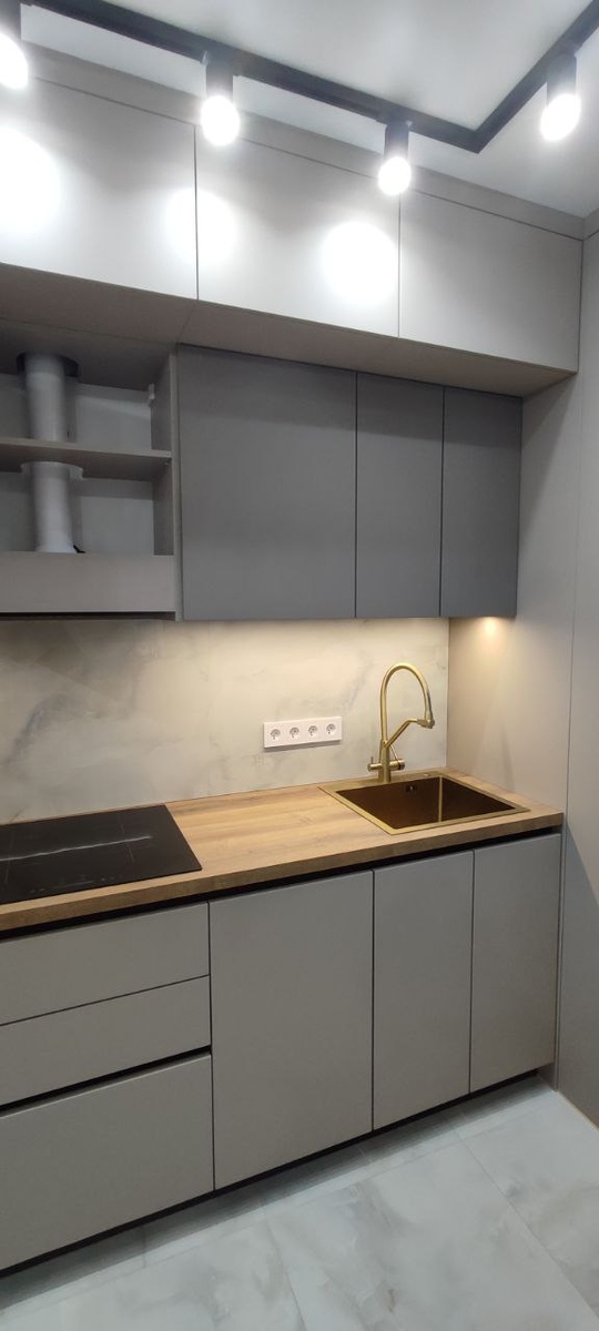 Под потолок, без ручек, в тёплых приятных тонах. Кухня небольшая, но с изюминкой😊. Угол использовали максимально, сделав там своего рода кладовку😊😊. Получилось интересно👍. Как вам?