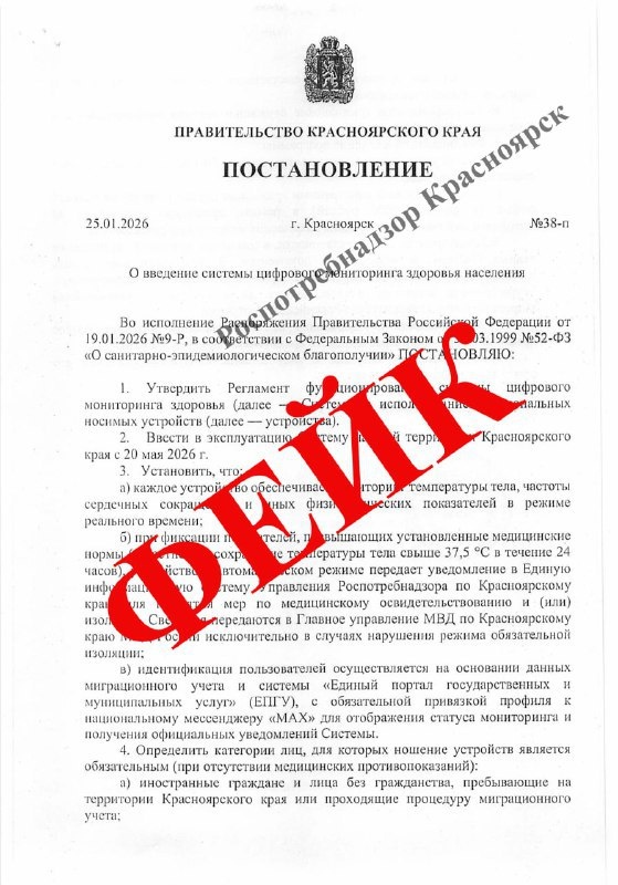 На электронный адрес краевого Роспотребнадзора пришел документ, якобы постановление краевого правительства. И там говорится, что в рамках так называемого цифрового мониторинга будут проверять температуру тела, частоту сердечных сокращений и другие показатели. Браслеты наденут на работников общепита, медиков, педагогов, госслужащих. В этот круг записали иностранцев и лиц без гражданства, которые находятся на территории края. И если будет зафиксировано повышение температуры более 37,5°С, человека изолируют в течение суток. Надо понимать, что это бред чистой воды, которому нельзя верить ни на одну каплю. 📸: Роспотребнадзор Подписаться на @kpkrsk