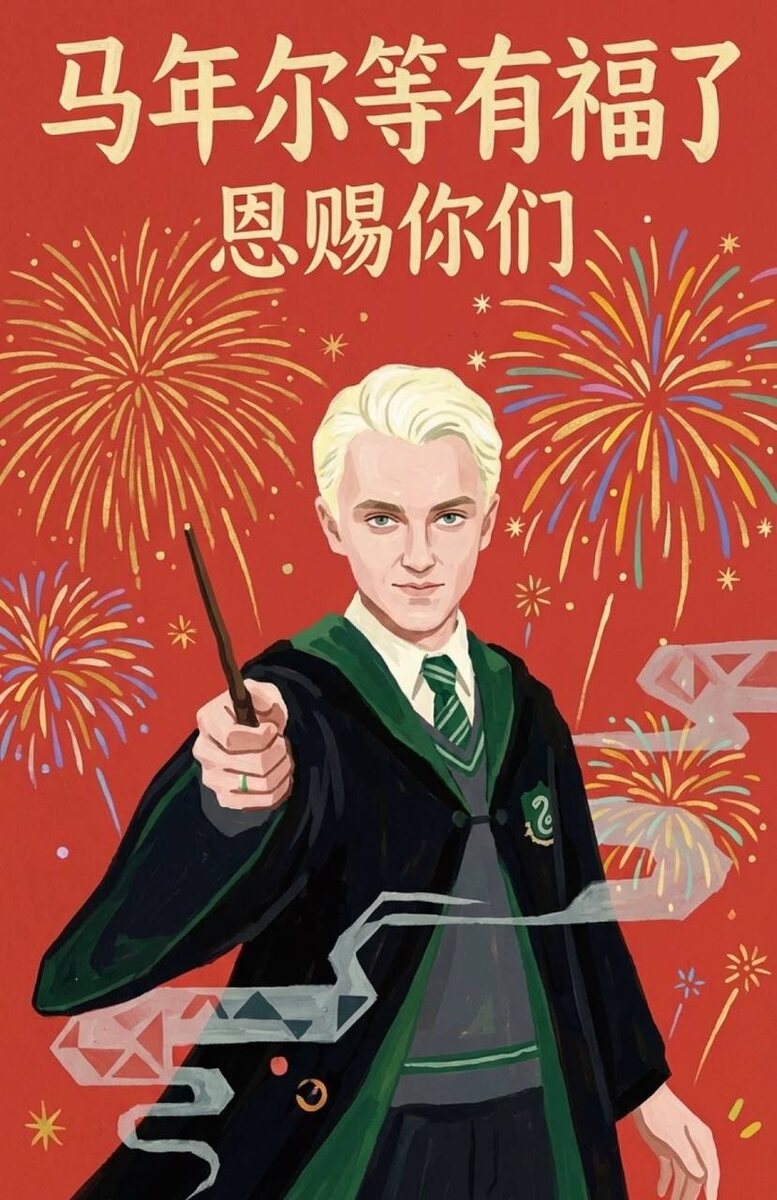 ? К Китайскому Новому году на двери вешают иероглиф 福 (fú) — «счастье». Часто вверх ногами, потому что 福倒了 звучит как 福到了 — «счастье пришло». А теперь магия 🪄 Драко Малфой по-китайски — 马尔福 (Mǎ ěr fú): 🐴 马 — лошадь 🧧 福 — счастье Итого: 🐴 + 🧧 = лошадь приносит счастье Так что если кажется, что на двери висит Малфой — значит, удача уже на подходе 😏 Повесили бы такого себе?