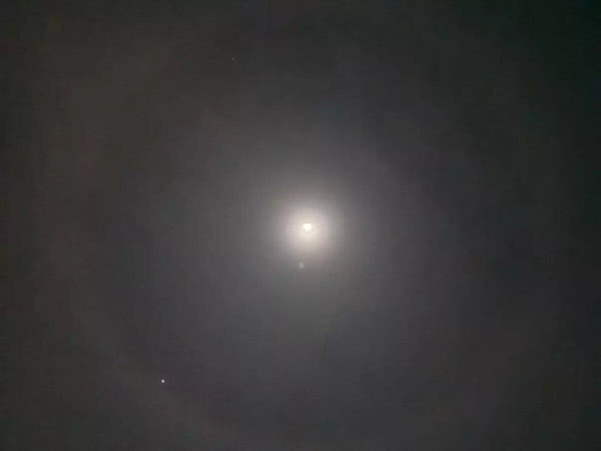В кадре видно, что на небе взошла яркая луна. Вокруг ночного светила образовалось так называемое кольцо. Также жители публикуют фото световых столбов. Лунное гало — это оптическая иллюзия, при которой вокруг Луны образуется яркое светящееся кольцо. Явление возникает из-за преломления света, проходящего через кристаллы льда в перистых облаках. В свою очередь, световые столбы (солнечные столбы) — визуальное атмосферное явление, оптический эффект в виде вертикальной полосы света, тянущейся вверх от источника света.