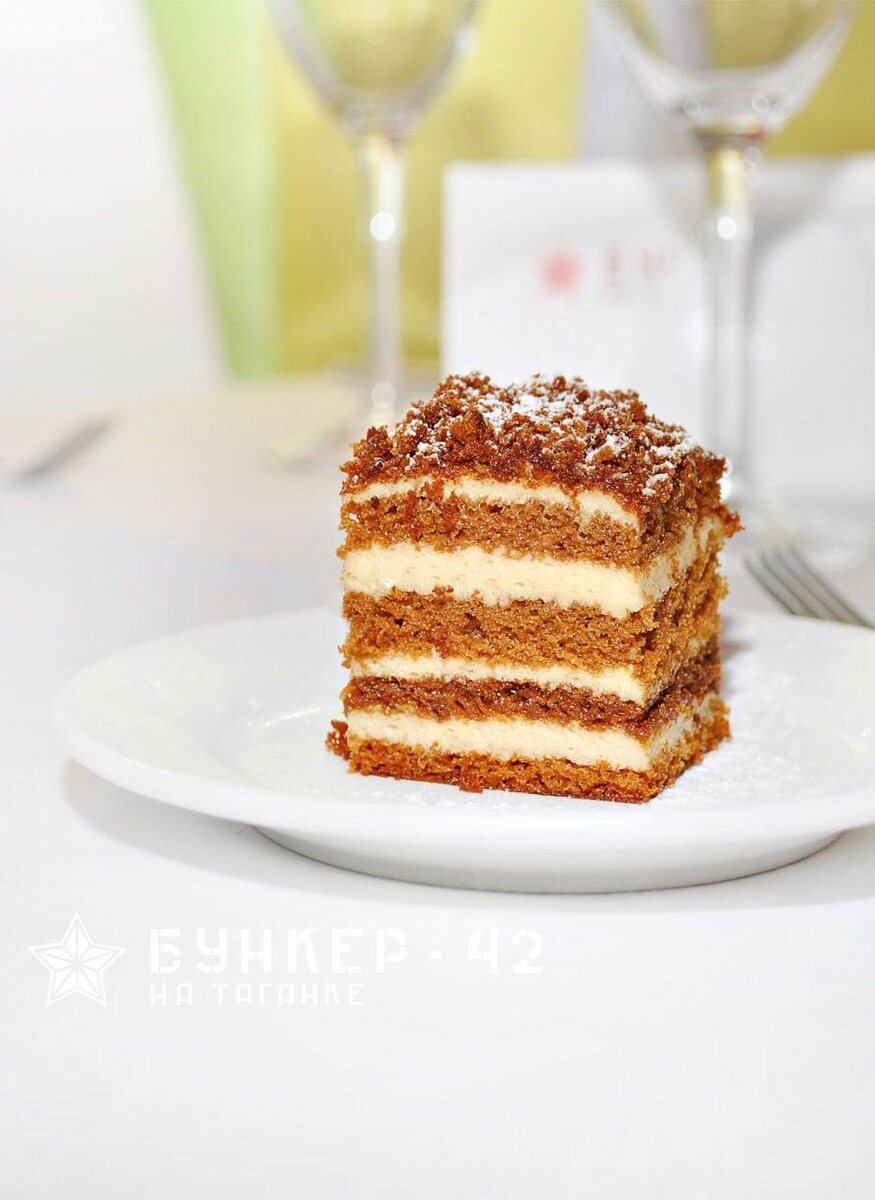 В ресторане «Бункер-42» вы можете выбрать классические десерты советского времени. Торт «Медовик» - мягкие, нежные коржи, пропитанные ароматным мёдом и воздушным кремом, буквально тают во рту, напоминая о любимых домашних вкусах детства.