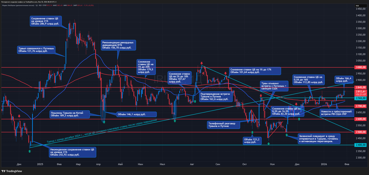 Безумный день вчера был день. Коротко, рост начался с утра после пробоя 2800 пунктов по индексу МосБиржи на фоне роста Лукойла после новостей о том, что компания заключила соглашение с Carlyle о продаже зарубежных активов и вброса про территориальные уступки. В преддверии намеченного на 1 февраля очередного раунда переговоров по мирному урегулированию стало заявление главы евродипломатии Каи Каллас. Она допустила, что Украине предстоит пойти на «серьезные территориальные уступки». Далее появились слухи о договоренности по возможному энергетическому перемирию между Москвой и Киевом. Какой-то военный блогер сообщил, что с 7 утра в Вооруженных силах РФ введен запрет на огневое поражение любых объектов инфраструктуры по всей Украине. Пресс-секретарь президента РФ на брифинге сказал, что пока не может комментировать эту информацию. На фоне вышеперечисленного индекс МосБиржи обновил четырехмесячный максимум до сильного дневного уровня сопротивления около 2845 пунктов, но затем испытал серьез