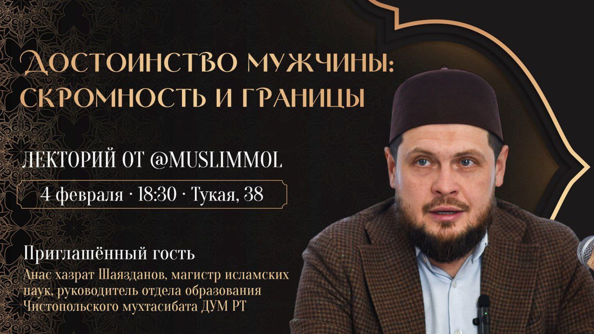 🌙В ДУМ РТ пройдет Лекторий на тему «Достоинство мужчины: скромность и границы». Лекция поможет получить чёткое и глубокое понимание этих ценностей в контексте исламского учения. 🎤Гостем Лектория станет Анас хазрат Шаязданов – магистр исламских наук и руководитель отдела образования Чистопольского мухтасибата ДУМ РТ. 📅Дата: 4 февраля (среда). 📍Место: г. Казань, ул. Габдуллы Тукая, 38. ⏰Время: в 18.30. 📿🤲Анас хазрат обладает не только глубокими академическими знаниями, но и богатым практическим опытом. Эта встреча – уникальная возможность провести время в кругу единомышленников, задать вопросы и обсудить значимые темы. 📅Присоединяйтесь! Наш канал в МАХ: max.ru/dumrt