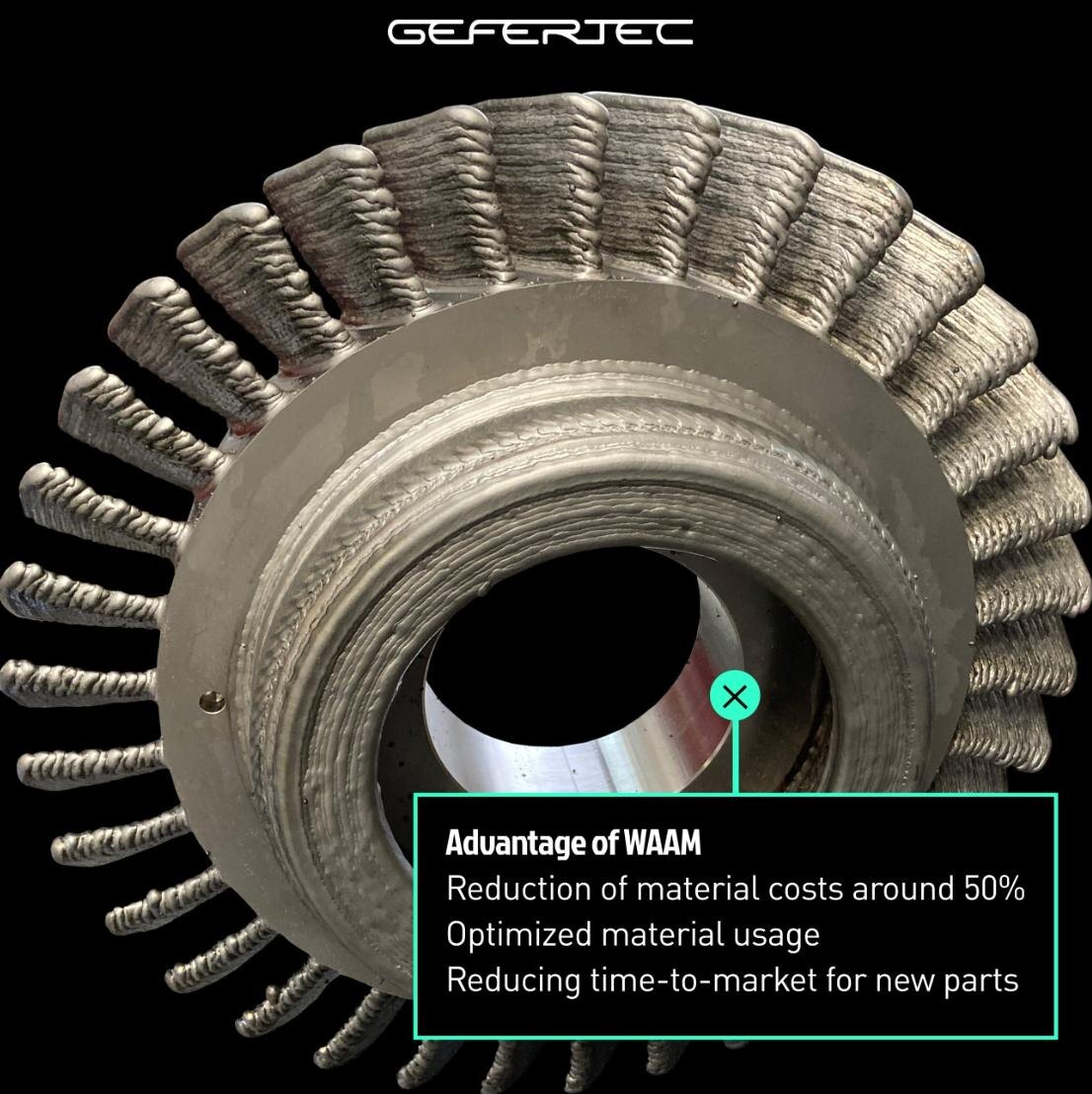 Рабочие колеса (блиски) для авиадвигателей — это монолитные детали, где лопатки и диск являются единым целым. Их создание — сложнейший процесс, требующий литья жаропрочных сплавов и филигранной обработки. Классический метод начинается с массивной кованой заготовки, превращаемой на этапе механообработки в конечное изделие. Это долго и невероятно затратно по материалу. Аддитивная технология Wire Arc Additive Manufacturing (WAAM) способна изменить этот устоявшийся подход. Вместо того чтобы фрезеровать колесо из 72-килограммовой кованой заготовки, можно вырастить её из проволоки. Напечатанная заготовка имеет вес всего 34,5 кг вместе со ступицей. Экономия материала приближается к 50%, а это уже огромное снижение стоимости. Минимальный припуск при 3D-печати позволяет сократить время на общий конструкторский и производственный цикл. В очередной раз множество технологий 3D-печати доказывают их главное преимущество — гибкость. Тестировать и внедрять изменения в конструкцию теперь можно практ