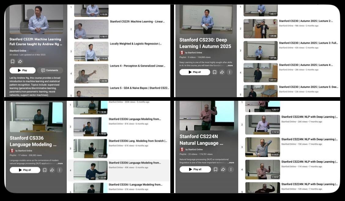 Те самые курсы, по которым учатся и учились инженеры Google, OpenAI и DeepMind. Если хочется не просто нажимать кнопки в нейросетях, а понимать, что под капотом, вот база: ❯ CS221 — основы искусственного интеллекта ❯ CS229 — машинное обучение с нуля ❯ CS230 — глубокое обучение и нейросети ❯ CS234 — обучение с подкреплением ❯ CS231N — компьютерное зрение ❯ CS336 — большие языковые модели, с самого начала 🎁 Вот это да! | Подписаться