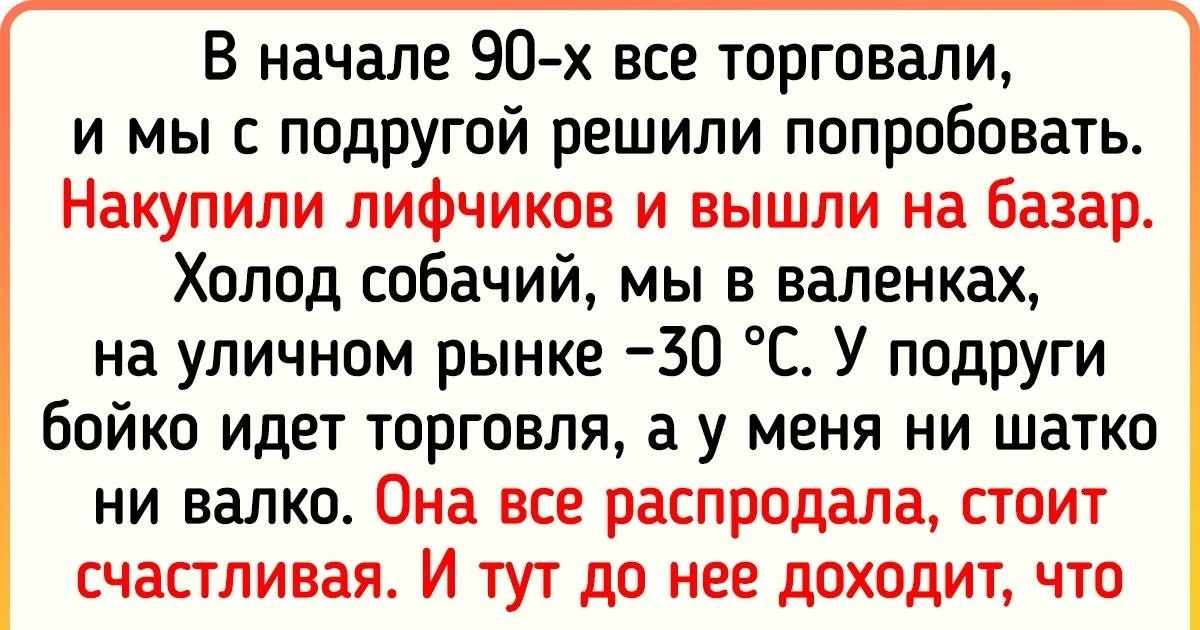 “В девяностые мы с подругой вышли торговать на рынок. Мороз минус тридцать, валенки, лифчики на прилавке. Подруга все продала, радовалась, пока не поняла, что продавала дешевле закупки. На этом ее бизнес закончился.”