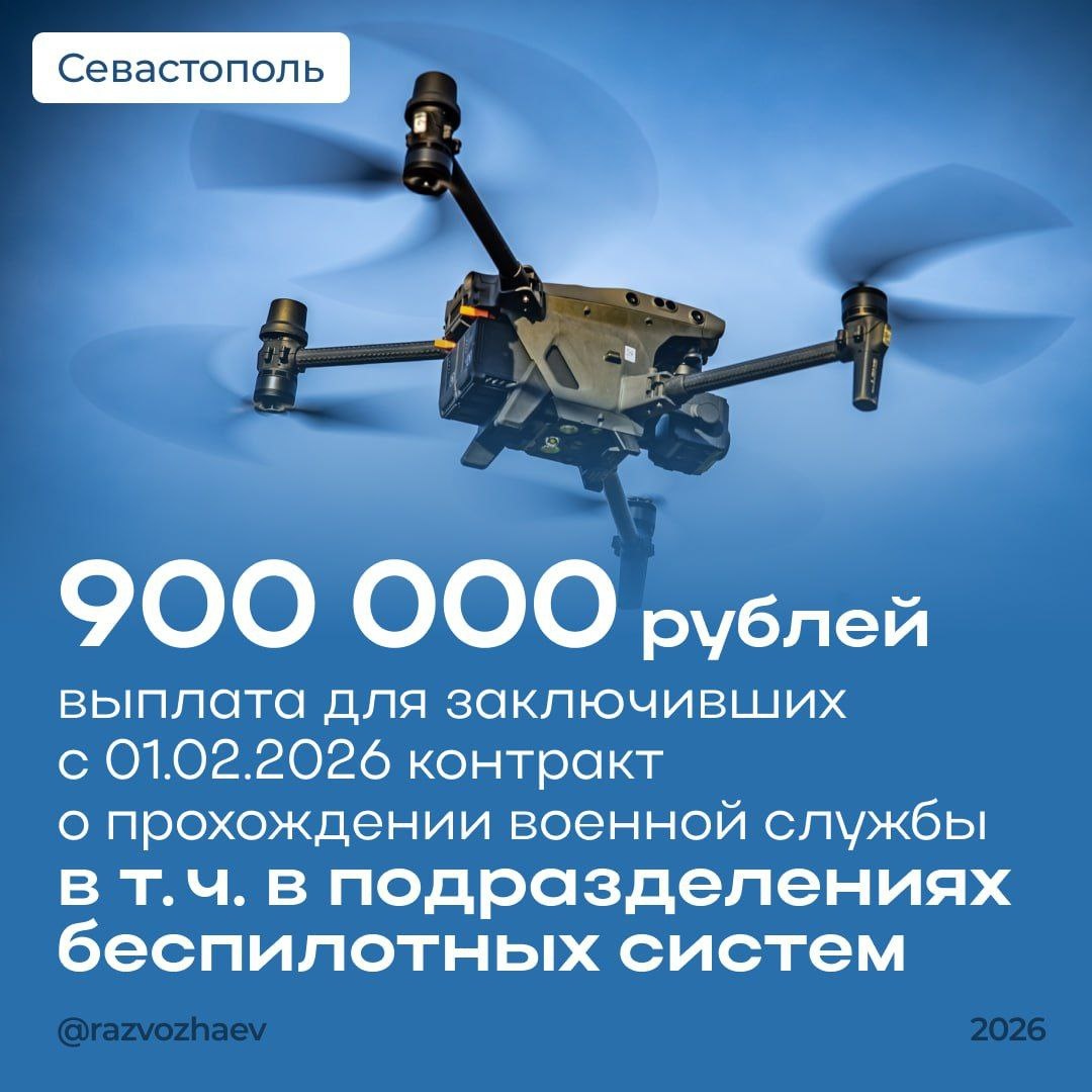 С 1 февраля 2026 года по поручению губернатора Михаила Развожаева региональная единовременная выплата для граждан, заключивших контракт с Министерством обороны РФ для участия в специальной военной операции, в том числе в подразделениях беспилотных систем, составит 900 тысяч рублей. Соответствующее постановление приняли на заседании правительства Севастополя. Ранее размер выплаты составлял 700 тысяч рублей — теперь её увеличили ещё на 200 тысяч. Средства назначаются автоматически, без подачи заявлений, на основании данных из военного комиссариата и пункта отбора. В Севастополе также действует комплекс мер поддержки участников СВО, включая социальные выплаты, компенсации расходов на ЖКУ, бесплатный проезд и помощь в трудоустройстве. Для заключения контракта обращайтесь в пункт отбора на военную службу по контракту по адресу: улица Коммунистическая, 3а. Телефон для справок: +7 (8692) 22-14-51. 📺 СТВ в MAX