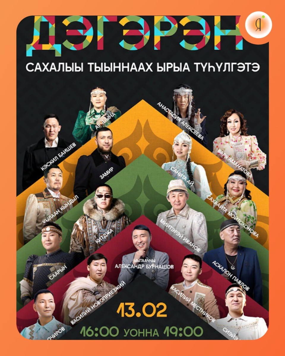 #Концерты Примут участие: 1. Виталий Очиров 2. Сиэйэ уола 3. Василий Новоприезжий 4. Василий Местников 5. Саарын 6. Китджа 7. Миитэрэй Иванов 8. Аскалон Павлов 9. Кылаан Кындыл 10. Замир 11. Санита Ай 12. Сахаайта Мойтохонова 13. Кэскил Баишев 14. Арчыына 15. Анастасия Алексеева 16. Варя Аманатова Ведущий - Александр Бурнашев 13 февраля | 16:00 | 19:00 КЦ «Сергеляхские огни», Белинского, 58а 1500 руб. +7 (964) 076-69-08 Подробнее Online Якутия | Ждем вас в МАХ