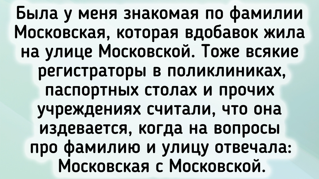 Моя знакомая в девичестве носила фамилию Дюдюкина. Вышла замуж — и стала Сюсюнина. В школьном журнале после Разина стоял Степанов. В нашей деревне девушка Маслёнкина вышла замуж за парня Лепёшкина, а Матюшкин женился на Митюшкиной. В техникуме были подружки с фамилиями Вишня и Черешня. Мой ник полностью мною выдуман! В реальности у меня самые обычные, неинтересные имя и фамилия. © Шарлотта-Ромуальдовна Предначертанская / Dzen Была у меня знакомая по фамилии Московская, которая вдобавок жила на улице Московской. Тоже всякие регистраторы в поликлиниках, паспортных столах и прочих учреждениях считали, что она издевается, когда на вопросы про фамилию и улицу отвечала: Московская с Московской. © Марина Сергеева / Dzen Была когда-то я на свадьбе у знакомой. Тамадами были господа с фамилией Злые. Он — Злой, она, соответственно, Злая. Мы тогда от их шуток просто животы надорвали. Я спросила: — А почему он не взял фамилию жены? Мне ответили, что её девичья фамилия — Дубина. Вот и представьте се