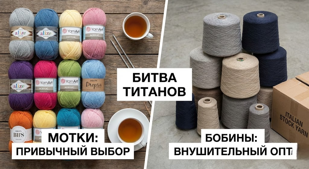 Если вы следите за вязальными блогерами или листаете ленту Pinterest, вы не могли этого не заметить. На смену уютным пирамидкам из маленьких моточков пришли они — огромные, тяжелые, промышленные конусы. Бобины. В вязальном мире произошла тихая революция. Мастера, которые еще вчера вязали из привычных турецких или дорогих моточных итальянских брендов, сегодня массово закупают «стоковую Италию» килограммами. Что это — очередная мода, навязанная маркетологами, или реальный способ вязать вещи люксового качества за вменяемые деньги? В Needle-Workshop мы привыкли разбираться в сути. Давайте честно взвесим все «за» и «против» в этой битве титанов. Моточки — это розница. Пряжа, специально произведенная для ручного вязания. Она красиво упакована (по 25, 50 или 100 грамм), уже отстирана, распушена и готова к работе сразу со спиц. Это привычные нам Alize, YarnArt, Drops, Lana Gatto, BBB и многие другие. Бобины (стоковая пряжа) — это опт и промышленность. Это остатки от производства коллекций модн