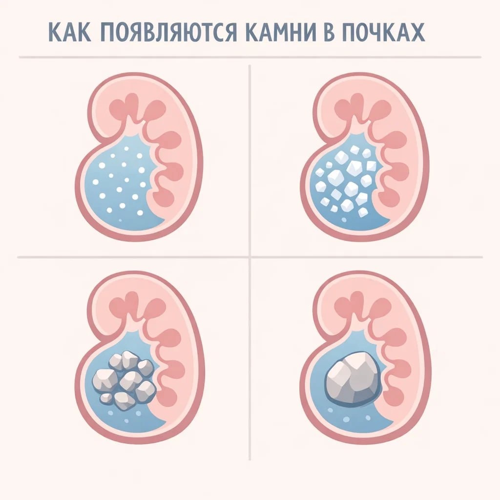🪨 Камни — это не «вдруг» Это результат долгого процесса ЧТО ПРОИСХОДИТ ВНУТРИ 🧠 В моче всегда есть соли и минералы В норме они растворены Но если концентрация растёт Они начинают кристаллизоваться 🔢Сначала — микрокристаллы 🔢Потом — песок 🔢Затем — камень ЧТО ЭТО УСКОРЯЕТ ⏱ — недостаток воды Моча становится слишком концентрированной — избыток соли и сахара Меняется минеральный баланс — нарушения обмена Оксалаты, мочевая кислота, кальций — хронические инфекции Создают «ядро» для роста камня — застой мочи Кристаллы не вымываются Чаще всего о нём узнают Когда он начинает двигаться И даёт резкую боль