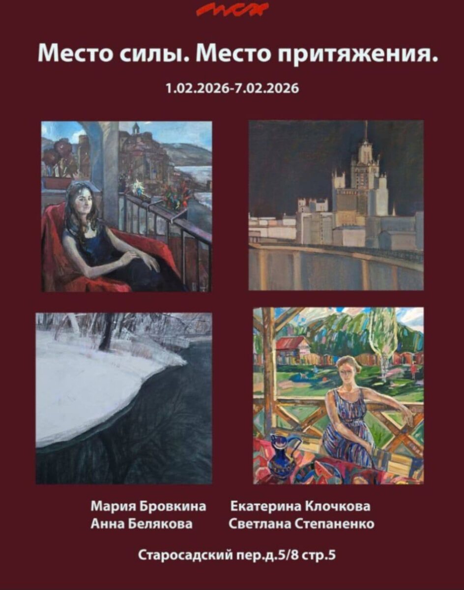 ! "Место силы. Место притяжения". У каждого человека есть уголок земли , где ему хорошо, уютно, куда хочется вернуться , где он получает заряд энергии и эмоций. На мой взгляд, это и есть место силы , место притяжения. Для художников такое место может стать источником для творчества и вдохновения ! Порой , увиденные те или иние пейзажи, образы людей , состояния , интерьеры , становятся для художника основополагающей темой в его творчестве. В работах авторов выставки " Место силы. Место притяжения " Беляковой Анны, Степаненко Светланы, Бровкиной Марии и Клочковой Екатерины звучат разные мотивы , потому что у каждого свой источник вдохновения. Но объединил этих художников Московский союз художников - наше Место силы и Место притяжения! 📍 Где: Москва, Старосадский пер, 5 🗓️ Когда: 1 — 7 февраля 2026 ⏰ Часы работы: Ежедневно с 12:00 до 18:00