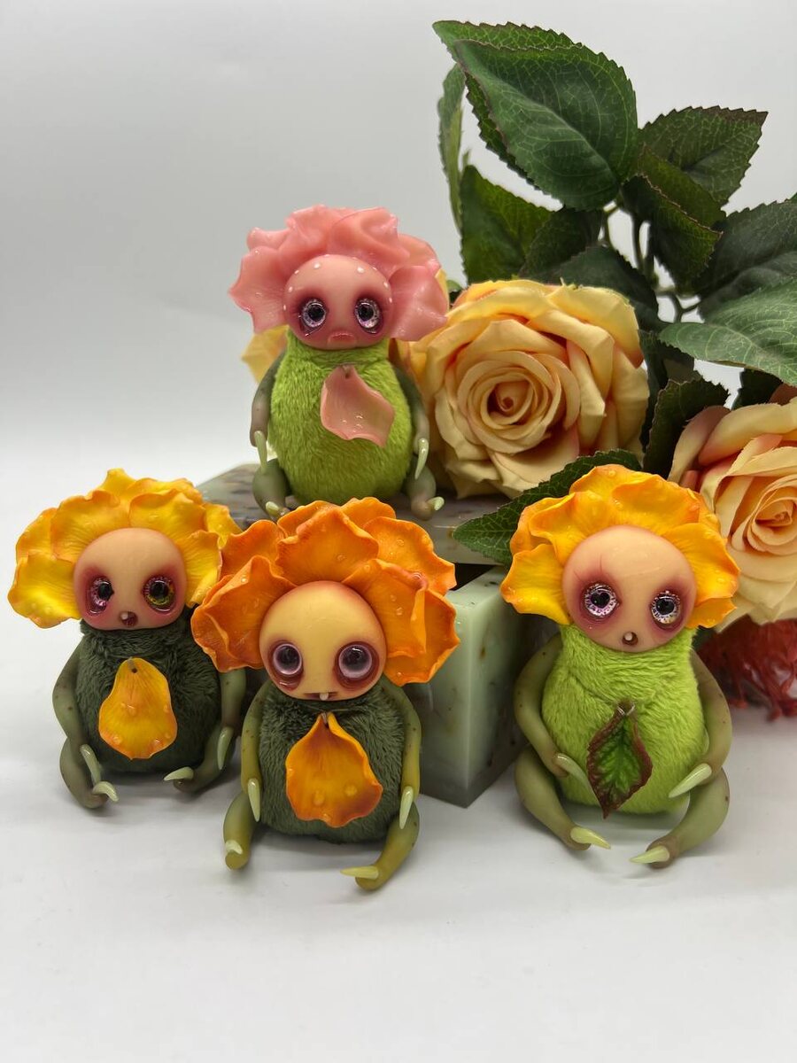 - Сочетание природных мотивов и фантазии. Головы существ украшены лепестками, напоминающими цветы, а их тела покрыты текстурой, имитирующей мох или листву. Это создаёт ощущение, будто они действительно родом из волшебного леса.