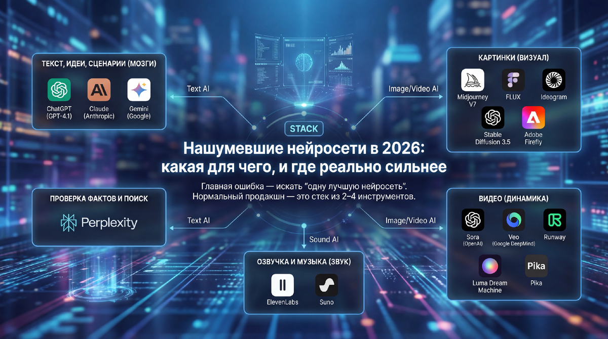 Главная ошибка — искать “одну лучшую нейросеть”. В реальной работе так не получается: текст, поиск фактов, картинка, видео и звук — это разные задачи. Нормальный продакшн в 2026 — это стек из 2–4 инструментов, где каждый делает своё и не мешает.