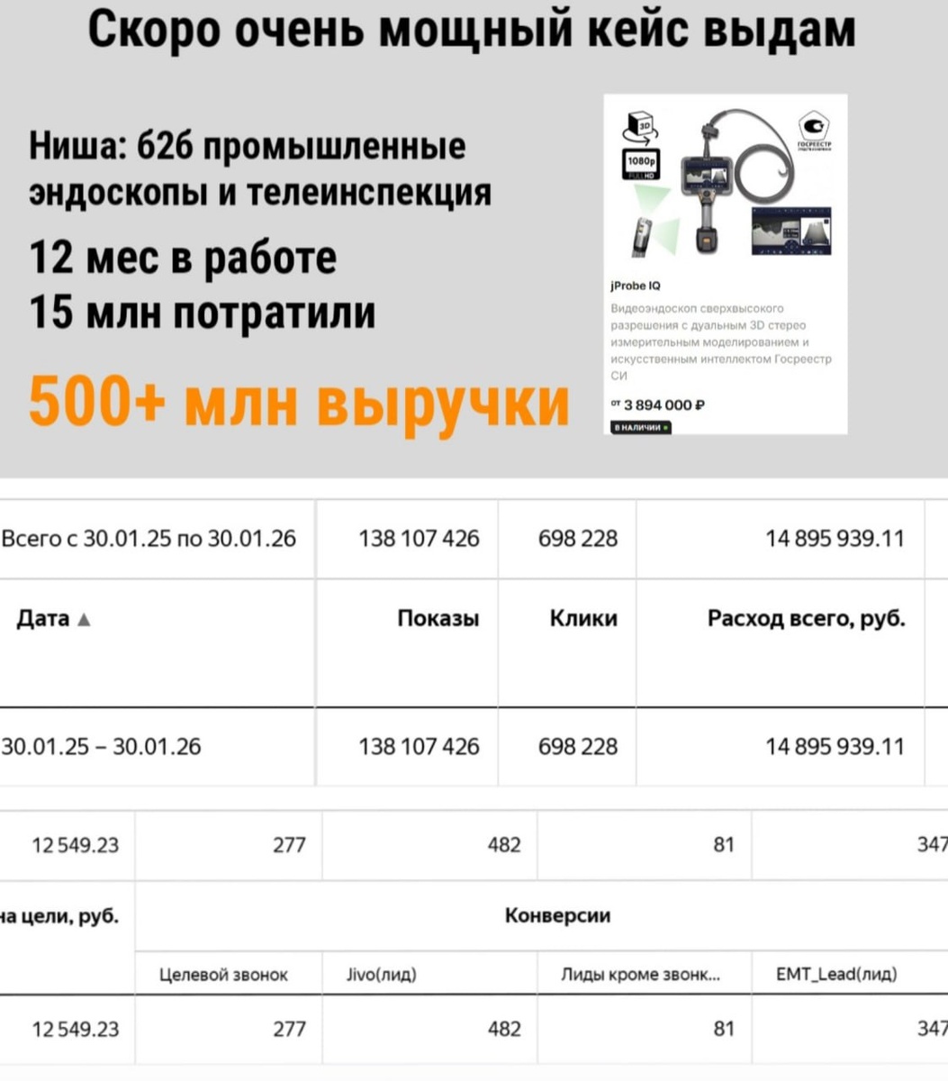 Сперва, уважаемые клиенты! На фото анонс кейса, которым я очень горжусь. Ниша технических эндоскопов очень сложная и требовательная к скиллу. Как минимум потому что 95% рынка эндоскопов — это медицинские. Представьте, сколько там мусорного трафика для промышленных? Предлагаю вам не дожидаться написания кейса, а связаться со мной лично. Я расскажу вам, как добился подобных результатов, и начнем работать. В феврале есть ровно 1 место для клиента с бюджетом 300к+/мес. Лучше 500+, вам же выгоднее будет, тк у Яндекса будет больше данных для обучения. За работу сейчас беру 60-120к/мес. Пишите @sergeysaxonov, обсудим. Теперь, дорогие коллеги! Ловите лайфхак) Кейсы писать долго и сложно. Особенно когда у вас много работы с текущими клиентами. Можно сделать анонс кейса, который привлечет клиентов на консультацию или аудит, там рассказать кейс и продать свои услуги. А писать кейс... Ну, напишите, когда время появится) ——————————————————— Настройка, консультация, обучение Отзывы