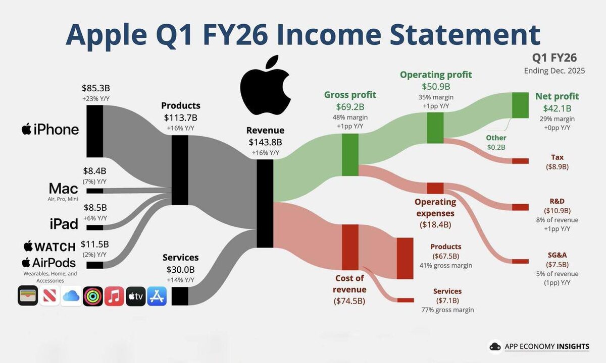 Выручка от iPhone и услуг достигла новых рекордных уровней! 📰 Apple опубликовала свой отчет о доходах за первый квартал 2026 финансового года. Выручка за первый финансовый квартал 2026 года достигла $143,8 млрд, увеличившись на 16% в годовом исчислении. Чистая прибыль составила $42,1 млрд Разбивка выручки: • 📱 iPhone — $85,3 млрд (+23%) • 💻 Mac — $8,4 млрд (-7%) • 📱 iPad — $8,5 млрд (+6%) • ⌚️ Носимые устройства, аксессуары и умный дом — $11,5 млрд (-2%) • 🌐 Услуги — $30,01 млрд (+14%) 📈 EPS: $2,84 (+19%) 💰 Объявлены дивиденды: $0,26, выплата 12 февраля 2026 года (дата фиксации — 9 февраля)