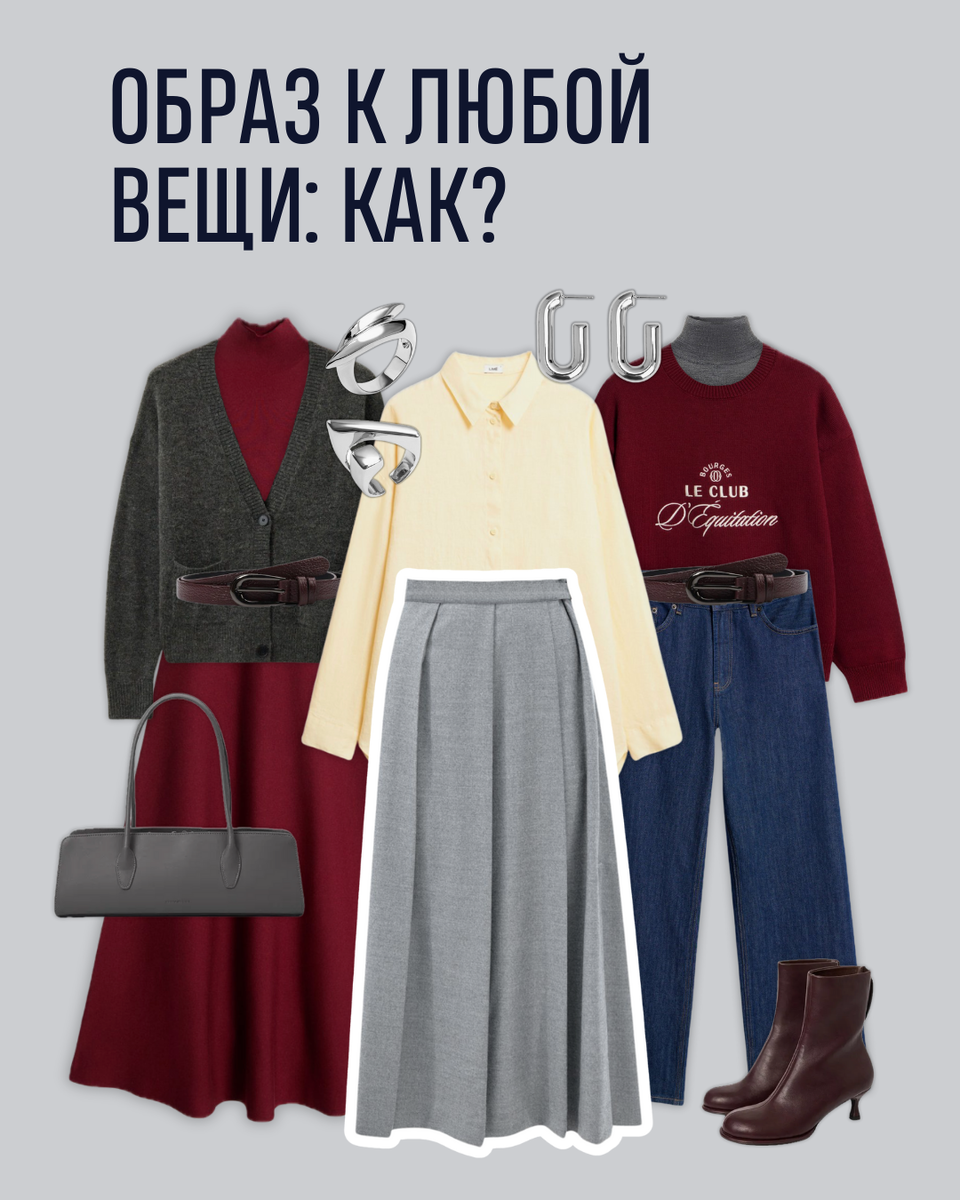 Как собрать образ или 💊капсулу под любую вещь? Вообще любую и за 3️⃣ шага👇🏻 ⠀ Мы возьмем 🩶серую юбку: ее прислали нам в комментариях. Но на ее примере покажем метод для всех вещей. ⠀ Шаг 1️⃣: описываем саму вещь. Ее цвет, длину, крой, ткань, принт, если есть, особенности (асимметрия, например). ⠀ У нас светло серая юбка длины мидакси, достаточно широкая, на высокой посадке, с широкими складками, из плотной тяжелой, держащей форму ткани. Если бы был принт, перечислили бы все входящие цвета и узоры. ⠀ Стиль скорее классический: отсылает куда-то в начало ХХ века, в старшие классы гимназий и на Высшие женские курсы, еще немного к суфражисткам. Ассоциации очень важны: их можно поддержать или сыграть на контрасте. Шаг 2️⃣: что мы строим? ⠀ Мы опираемся на ассоциации со студентками и началом века и строим классический образ с устойчивым силуэтом, из плотных тканей. Серый используем как фон для контраста бордового со сливочно желтым💛 ⠀ Другие варианты: оставить монохром в разных о