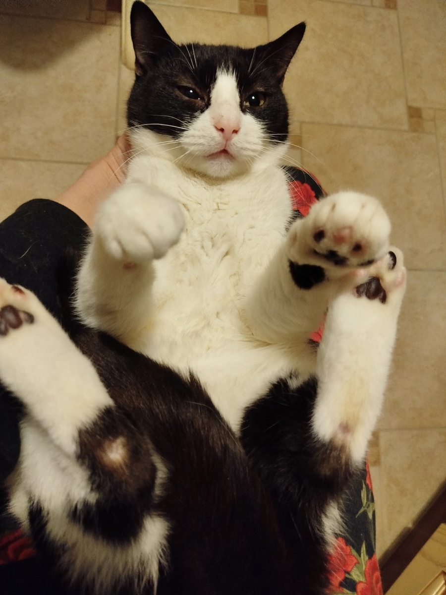 Когда-то этот очаровательный чернобелый котёнок был напуганным малышом, а теперь превратился в уверенного красавца, обожающего нежиться на коленях мамы Маши и радовать её каждый день!