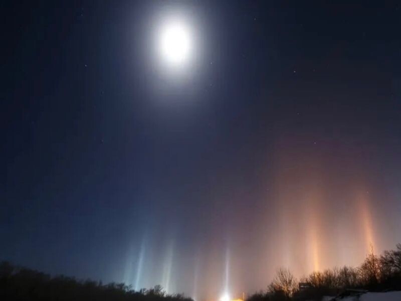 Лунное гало — это оптическая иллюзия, при которой вокруг Луны образуется яркое светящееся кольцо. Такое явление возникает из-за преломления света, проходящего через кристаллы льда в перистых облаках. В свою очередь, световые столбы (солнечные столбы) — визуальное атмосферное явление, оптический эффект в виде вертикальной полосы света, тянущейся вверх от источника света.