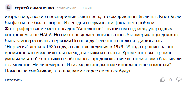 Если ваш критерий истины: “докажите так, чтобы я не смог сказать ‘подделка’”, то вы не скептик. Вы просто заранее решили ответ и ищете красивую оправдалку. “Неоспоримые факты” — это прекрасно. Только практика показывает: каждый второй просит “факты”, а потом вежливо (или не очень) сообщает, что принимать он их не будет. Потому что в голове уже заготовлен универсальный переход: “НАСА подделало / купило / запугало / договорилось”. Итого: проблема не в том, что “нет фактов”, а в том, что факты принимаются только те, которые заранее назначены допустимыми. А список “допустимых” у вас почему-то устроен так, что он всегда пустой.