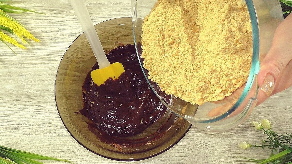 Добавляем крошку из печенья в миску с шоколадной массой, перемешиваем.