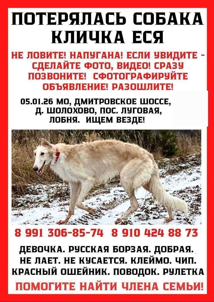 Еся: сука, русская псовая борзая,высокая,белая с кремовым оттенком по спине и бокам. Был надет красный ошейник. Убежала вместе с рулеткой. Очень добрая, не кусается и не лает.