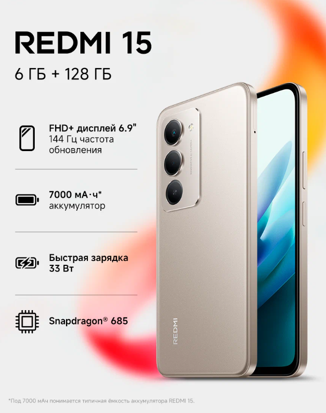 REDMI 15 6 ГБ позиционируется как смартфон среднего ценового сегмента с акцентом на автономность и производительность. Определите основные характеристики устройства и оцените его конкурентоспособность.