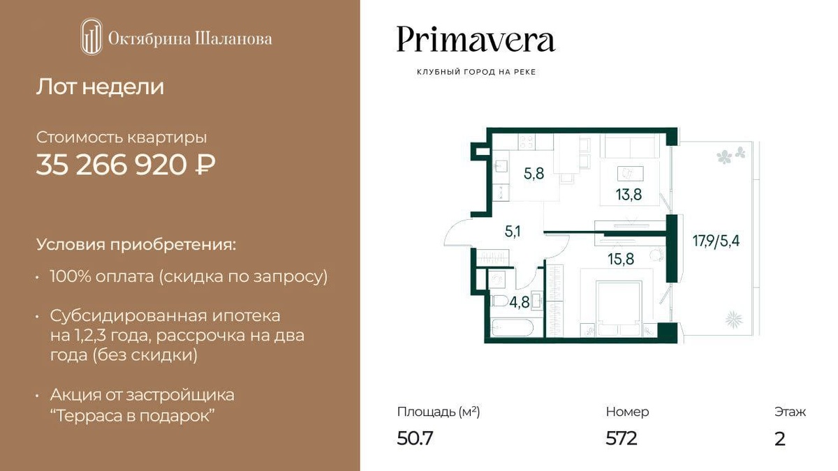 ! 🔥🔥 Представляем эксклюзивный лот в Клубном городе на реке Примавера. Квартал Vivaldi ключи сразу после сделки! Квартира на 2-м этаже с просторной террасой 17,9 кв.м Цена прайс – 35 266 920 руб. Цена по акции «Терраса в подарок» – 31 387 558,8 руб. Стоимость в ДДУ – 30 759 791,4 руб. Условия приобретения: 100% оплата, ипотека, субсидированная ипотека на 1,2,3 года ✔️Пишите в личное сообщение в случае заинтересованности подобными предложениями. #акция #эксклюзивный лот #предложение.