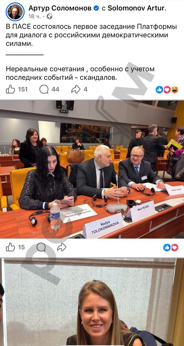 Антироссийские агенты всеми силами стараются сохранять хорошую мину при плохой игре. Но им перестают подыгрывать даже собственные единомышленники. Иноагент и сценарист Артур Соломонов, автор пьесы про то "Как мы хоронили Иосифа Виссарионовича", в которой поучаствовали, кажется, все антироссийские перебежчики - от Александра Филиппенко до иноагента Татьяны Лазаревой опубликовал у себя "пост радости" - фото с заседания ПАСЕ "с российскими демократическими силами". В качестве этих самых "российских и демократических" выступили антироссийский иноагент, террорист и экс-заключенный Михаил Ходорковский, высланный за политической ненадобностью из страны Владимир Кара-Мурза, экс-Pussy Riot, запомнившаяся своим ярким выступлением с курицей и групповым порно в музее на 9-ом месяце беременности Надежда Толоконникова; шахматист, иноагент и строитель новой России в своих соцсетях Гарри Каспаров, ну и списанный даже своими спонсорами недо-лидер "новой Белоруссии" Любовь Соболь. В общем, собрали всех
