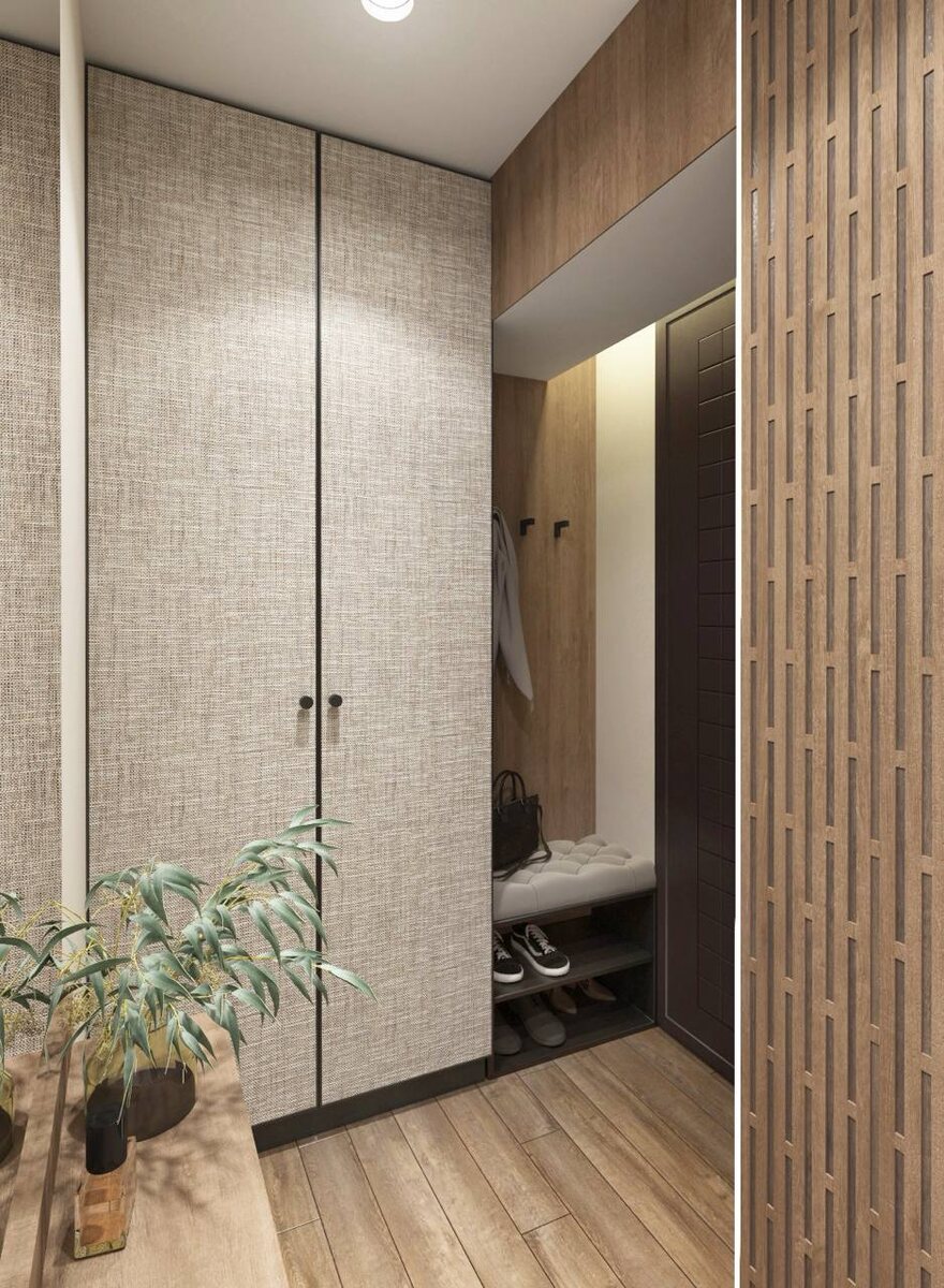 Это маленькое пространство мы с заказчиками постарались сделать очень функциональным - вместили как можно больше мест для хранения: пара шкафов для одежды (плюс отсек для хоз инвентаря), открытая панель с крючками у входа, стеллаж для сумок/обуви, и консоль с зеркалом для мелочей. Здесь соседствуют разные текстуры отделки - единая древесина на корпусе и панелях, ткань на фасадах одного из шкафов, зеркало на другом. Все эти приёмы не случайны - они делают пространство многоплановым, интересным, визуально лёгким и гармоничным.