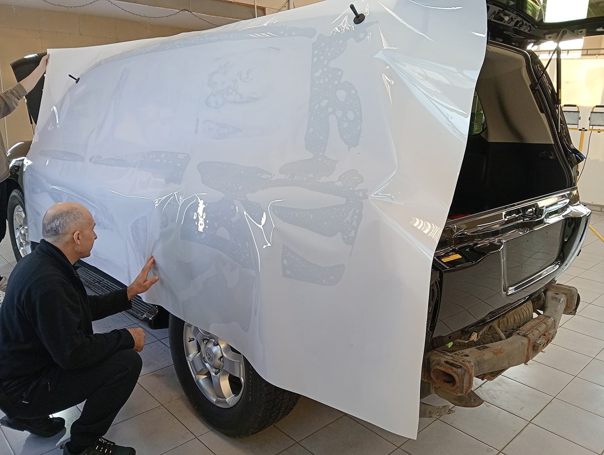 крылья с переходом на крышу, передние стойки) необходимо покрыть цельным полотном, без стыков и соединений. Антигравийная плёнка - это инвестиция, позволяющая защитить кузов автомобиля даже при активной эксплуатации. На фото: подготовка пленки к оклейке кузова TLC 200.