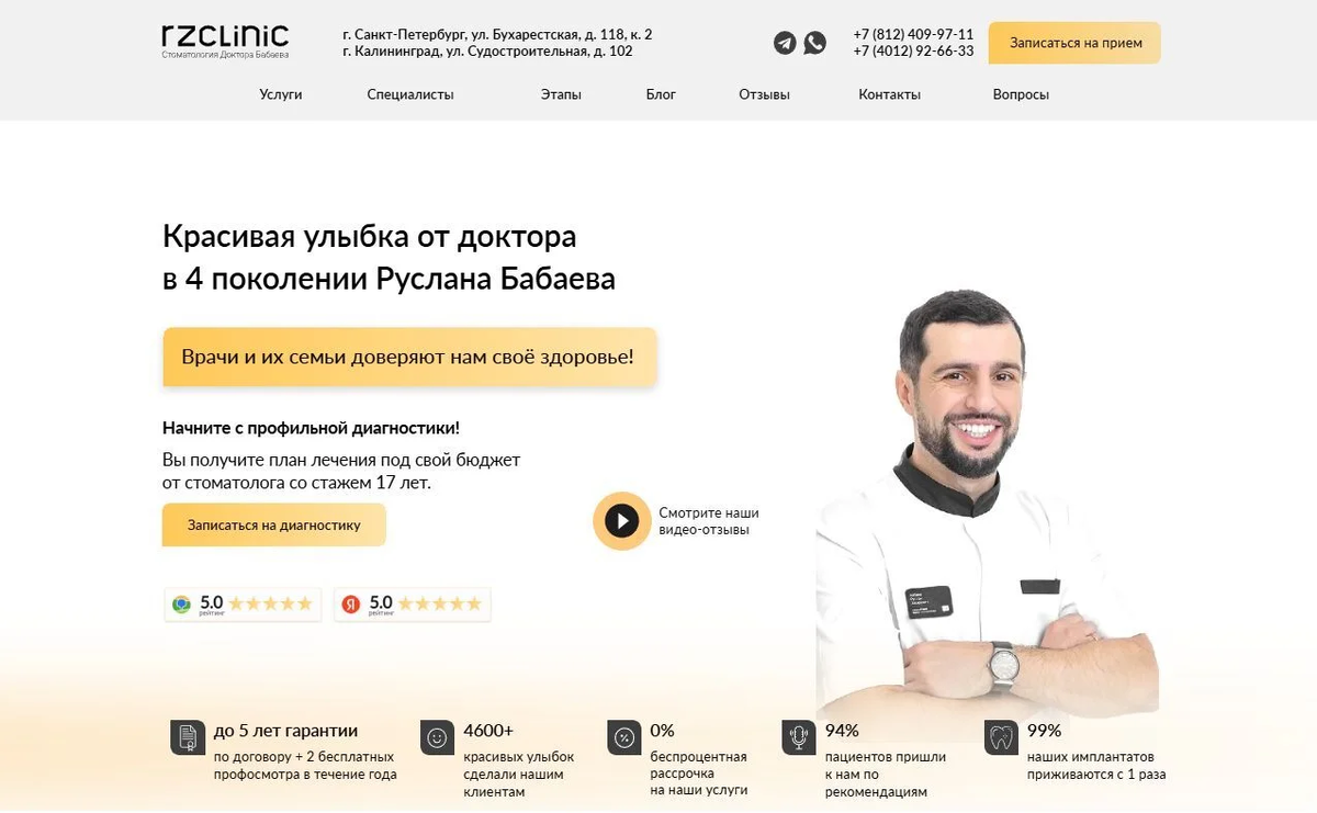 "Еще одна стоматология" или "Та самая клиника"? Когда одна строчка все решает Открываете любой город — там 50+ стоматологий. У всех импланты, у всех опытные врачи, у всех "современное оборудование". И все гордо уверяют: "Лечим зубы качественно!" Представьте, клиент выбирает между двумя клиниками: гуглит отзывы, смотрит цены, листает инстаграм. А потом натыкается на строчку: "Красивая улыбка от доктора в 4 поколении". Не "качество", не "опыт" — конкретика, которая цепляет мозг. И что-то внутри щелкает — выбор сделан. Потому что "семейное дело" — это не просто красивая история для сайта. Это неформальная гарантия: если деды сохраняли здоровье пациентов, отцы продолжили традицию — значит, есть основания доверять и следующему поколению. Логично? Не совсем. Но это работает тогда, когда это правда. Поэтому мы выстроили вокруг династии врачей основу позиционирования. С клиникой доктора Бабаева мы сознательно выстраивали баланс: создали многостраничный сайт, который транслирует и семейную ис