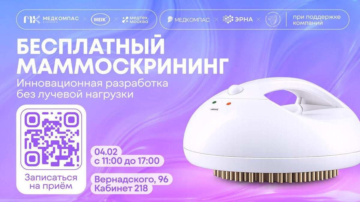 4 февраля, во Всемирный день борьбы против рака, Медкомпас-клиника и MEIK проведут бесплатное исследование груди для всех женщин. ➖ Электроимпедансная томомаммография – метод, позволяющий без лучевой нагрузки получать изображения молочных желез за счёт оценки электропроводности тканей и выявлять изменения. Скрининг могут пройти все женщины: 🔵 в период лактации 🔵 во время беременности 🔵 в любую фазу менструального цикла Исследование займет 5-10 минут (предварительная подготовка не требуется). Результаты вы получите по электронной почте. 🔵 Место: Медтех (проспект Вернадского, 96), 2 этаж, кабинет 218 🔵 Дата и время: 4 февраля с 11:00 до 17:00 Участие бесплатное – запись по телефону: +7 (936) 444-13-35