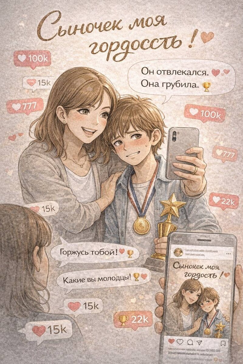 Или как мама делает из сына свой Instagram-фильтр. Есть мама, которая говорит: — «Я для него всё». И это правда. Потому что ребёнок для неё — не отдельный человек, а нарциссическое расширение. Как дорогая сумка. Как диплом на стене. Как сторис с подписью: «горжусь». Такую маму легко узнать. Она говорит: — «Мы поступили» — «У нас победа» — «Мы такие умные» А когда что-то идёт не так: — «Он меня подставил» — «Она меня опозорила» — «После всего, что я для тебя…» Ребёнок здесь — не субъект. Он проекция. Что движет такой мамой? Не любовь. А голод. Голод по: — признанию — значимости — ощущению «я хорошая» — доказательству своей ценности миру Если мама внутри пустая — ребёнок становится контейнером. Заполняй. Радуй. Подтверждай. Не подведи. Как это ощущается ребёнку? Как жизнь под прицелом. Ты не живёшь — ты выступаешь. Ты не ошибаешься — ты позоришь. Ты не выбираешь — ты предаёшь ожидания. Любовь есть. Но она условная. Пока ты соответствуешь. Чем это заканчивается? Спойлер без розовых фил